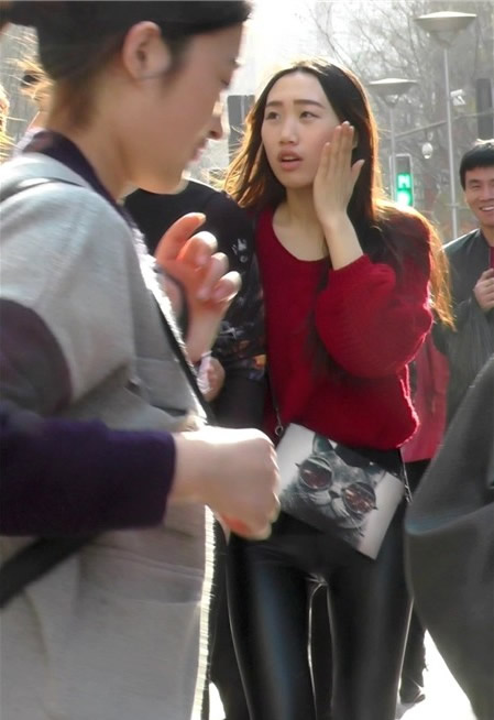 街拍紧身黑色皮裤苗条女生与男友逛街!怎么会有这么美丽的臀部呢(3)