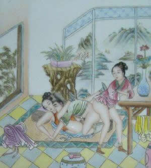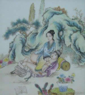 "素女"指房中术《素女经》。将春宫画与小姐观看的习惯,在中国古典文学中也有描写。唐代诗人白行简《天地阴阳交欢大乐赋》就说到《素女经》画册。清代李渔《肉蒲团》中的未央生,为了陶养一位如泥朔木雕、毫无生趣的绝色女子,"到书画铺买幅绝精绝巧的春宫册子,是本朝学士赵子昂的手笔,共有三十六套,唐诗上三十六宫都是春色的意思,拿去放在闺阁之中,好与玉香小姐共同翻阅。"可见在中国古代,春宫图的作用之一是作为进行性教育的媒介。除此以外,春宫图还作为"避火图"、"护书"和"嫁妆画"在民间大量流行。明、清两代,天津杨柳青等地的一些妇女每年春节前将春宫画当做年画销售,这就是有名的"女儿春"。